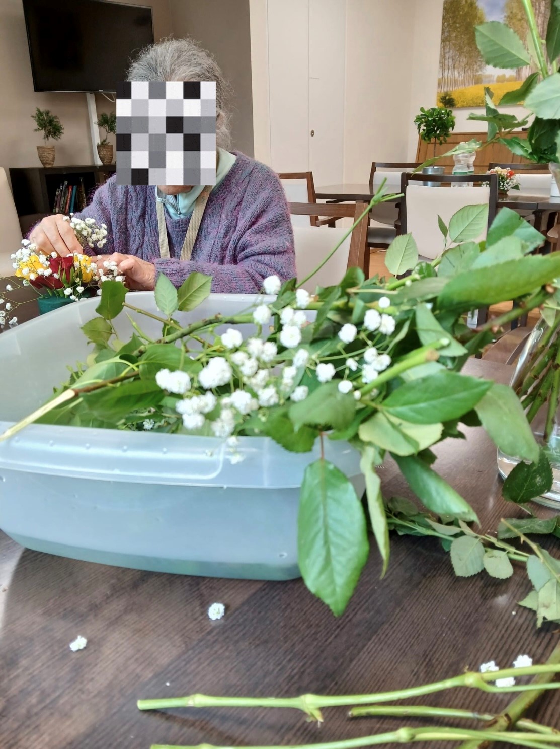 Gemeinsam verbrachten sie einen angenehmen und unterhaltsamen Nachmittag. Die liebevoll arrangierten Gestecke durften anschliessend mitgenommen und als dekorative Farbtupfer in den eigenen Zimmern aufgestellt werden.